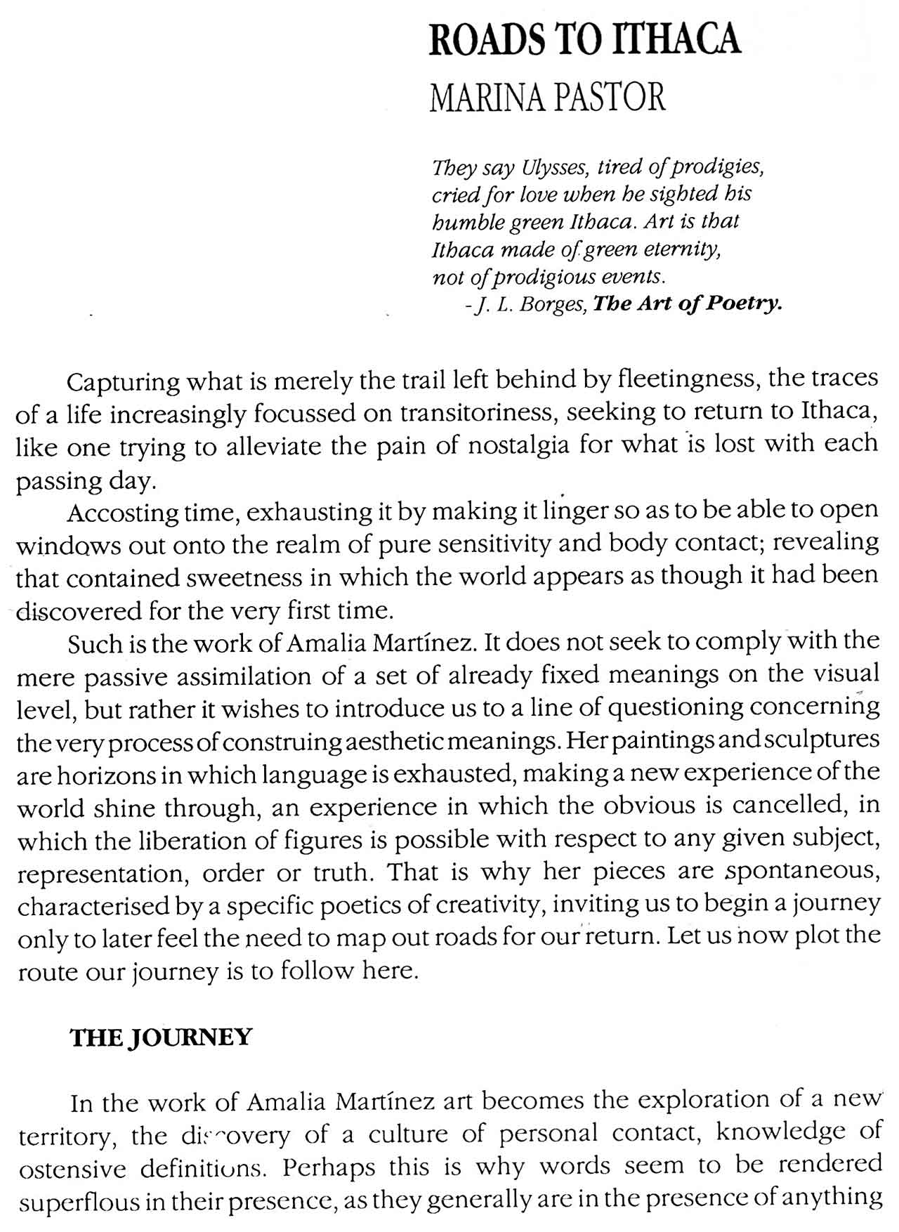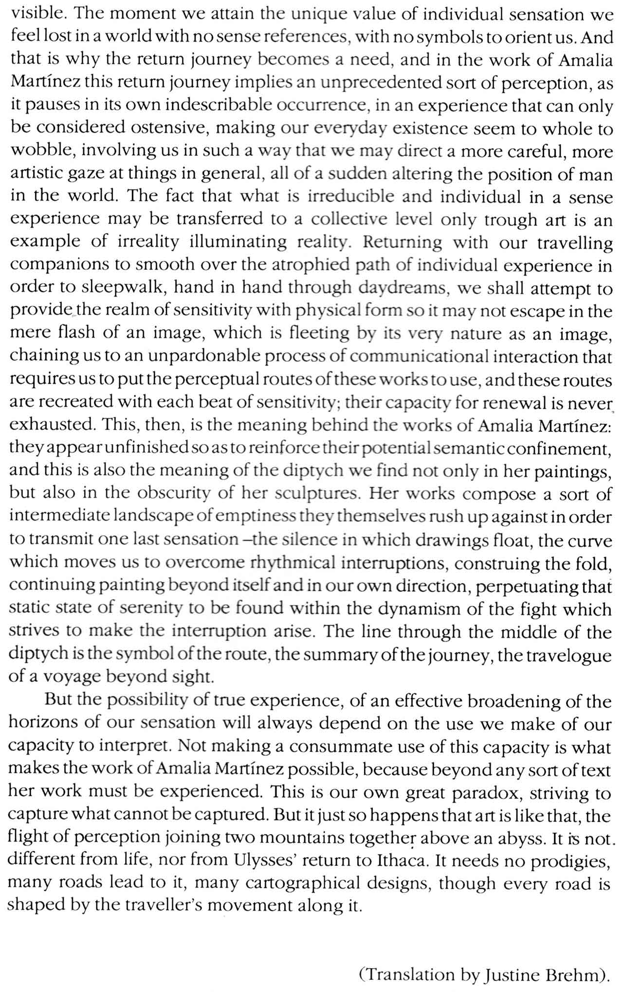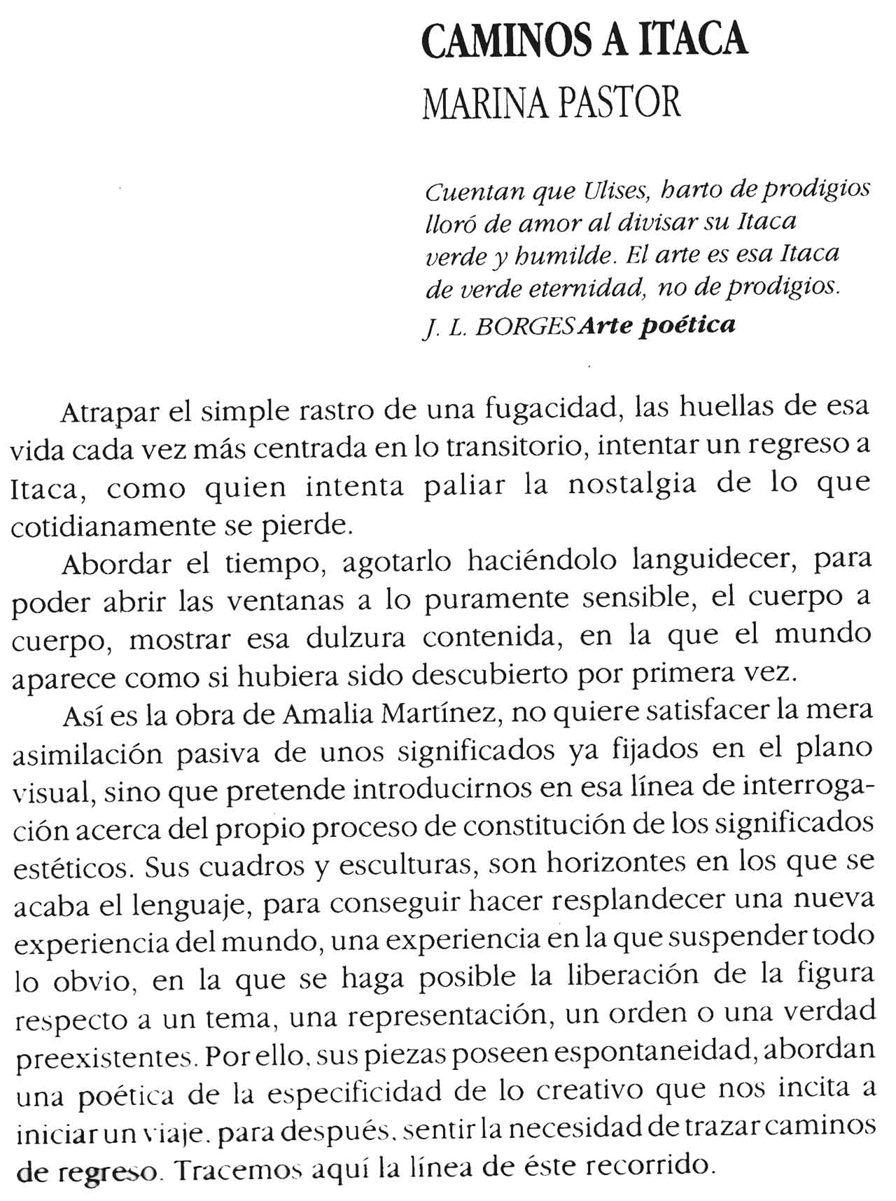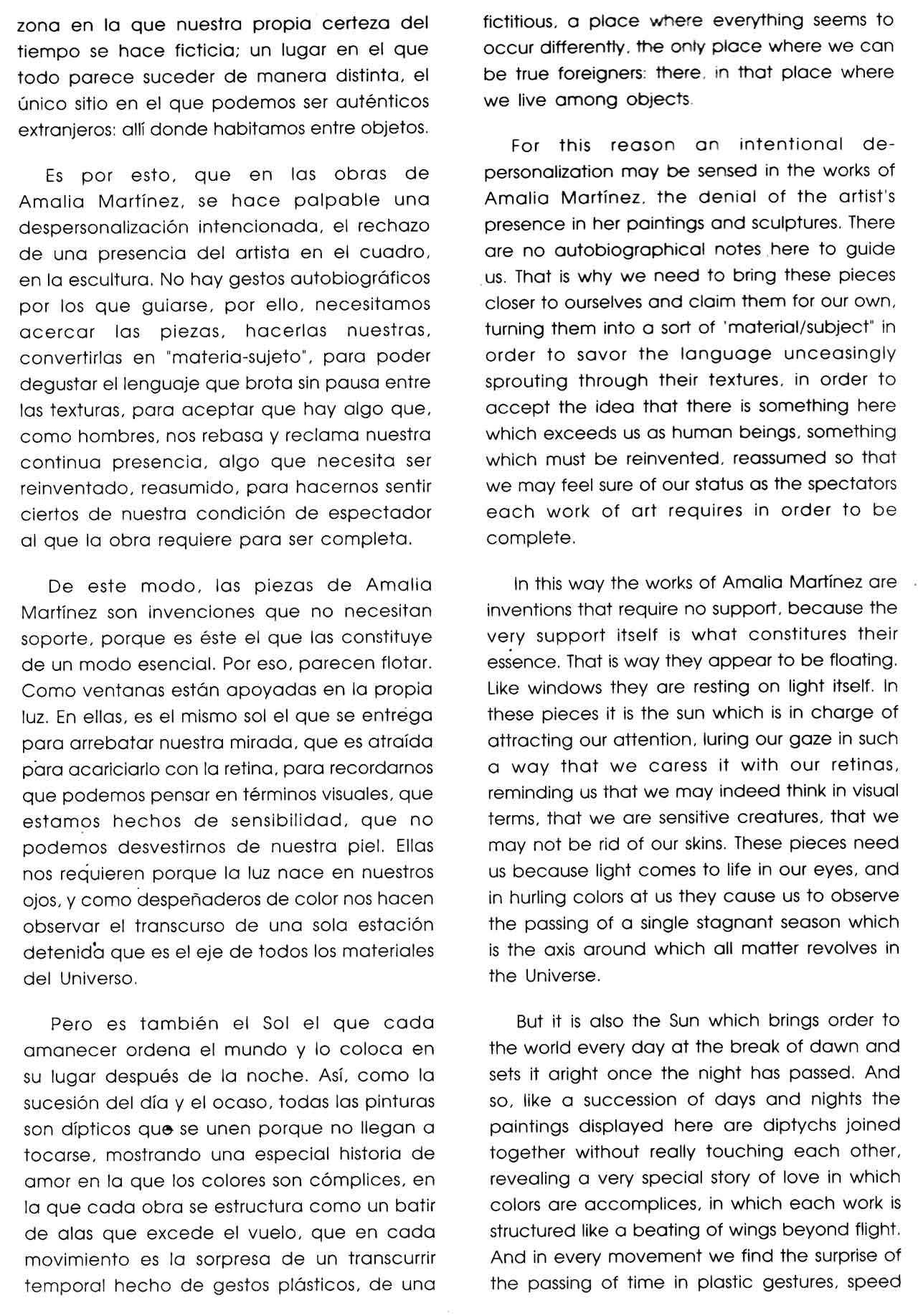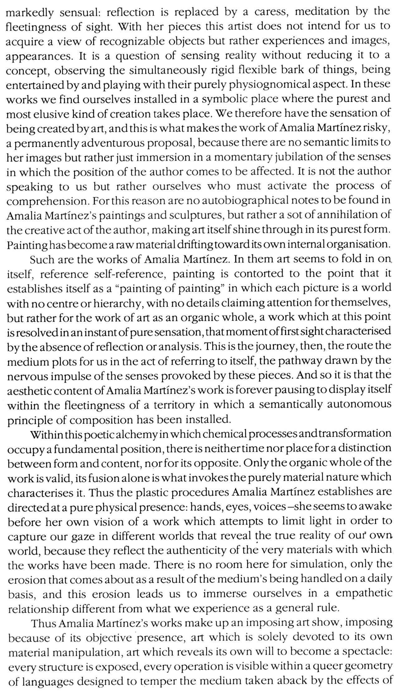 Mi trabajo está guiado por el interés en resaltar esa autonomía de los elementos plásticos. La aparente heterogeneidad de las diversas propuestas de mis pinturas queda minimizada por el imperativo del protagonismo de los rasgos formales compartidos por todas ellas -abstractas y figurativas-, que es lo que determina su singularidad, su validez específica y diferencial.