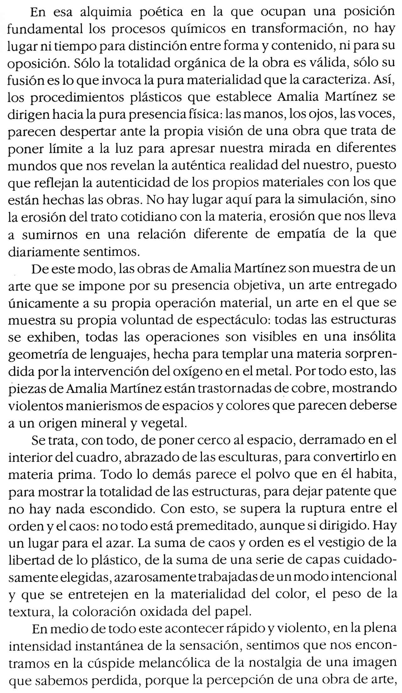 De lo anterior deriva la convicción de que el discurso teórico sobre el que se sustenta el arte, aunque imprescindible e insoslayable (lo hay incluso cuando se desconoce o se niega), no puede suplantarlo. El discurso no puede sustituir o dejar en un segundo plano, haciéndolo irrelevante, el trabajo plástico; no hay que confundir la reflexión sobre el objeto con el propio objeto. No existe una correspondencia unívoca entre idea y obra; la misma idea puede encarnarse en una extraordinaria diversidad de imágenes u objetos. Lo sustancial, lo que da identidad a una obra (pintura, escultura, performance, o cualquier otra forma de realidad artística), no es el concepto que la sustenta, sino su materialización. El abuso que se hace de la etiqueta «arte conceptual», conduce a menudo a justificar y dar estatuto de arte a cualquier cosa bajo el paraguas de consignas y banalidades sacralizadas por simple repetición; de discursos que son manifestación palmaria de la ausencia de esa reflexión que pretenden encarnar. Me rebelo contra el desprecio que desde esa etiqueta se hace del placer visual tachándolo de trivial y epidérmico y que indica, no sólo falta de criterio para valorar la sustancia de las obras poniendo a todas en un mismo nivel, también, con demasiada frecuencia, muestran ignorancia de la Historia y la Filosofía del Arte, y una ceguera que no alcanza a comprender aquella afirmación de Paul Valéry: lo profundo está en la piel.